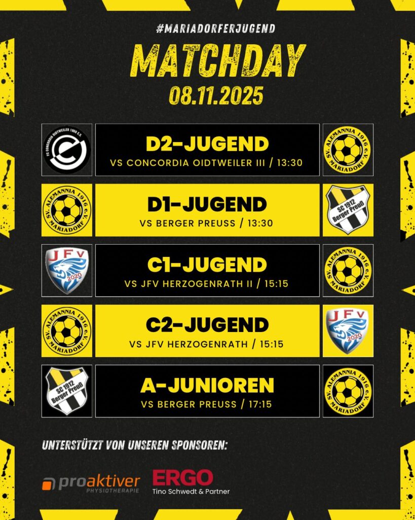 • ⚫🟡 C1- und C2-Jugend spielen beide um 15:15 Uhr gegen starke Gegner des JFV Herzogenrath – hier ist also doppelte Unterstützung gefragt!