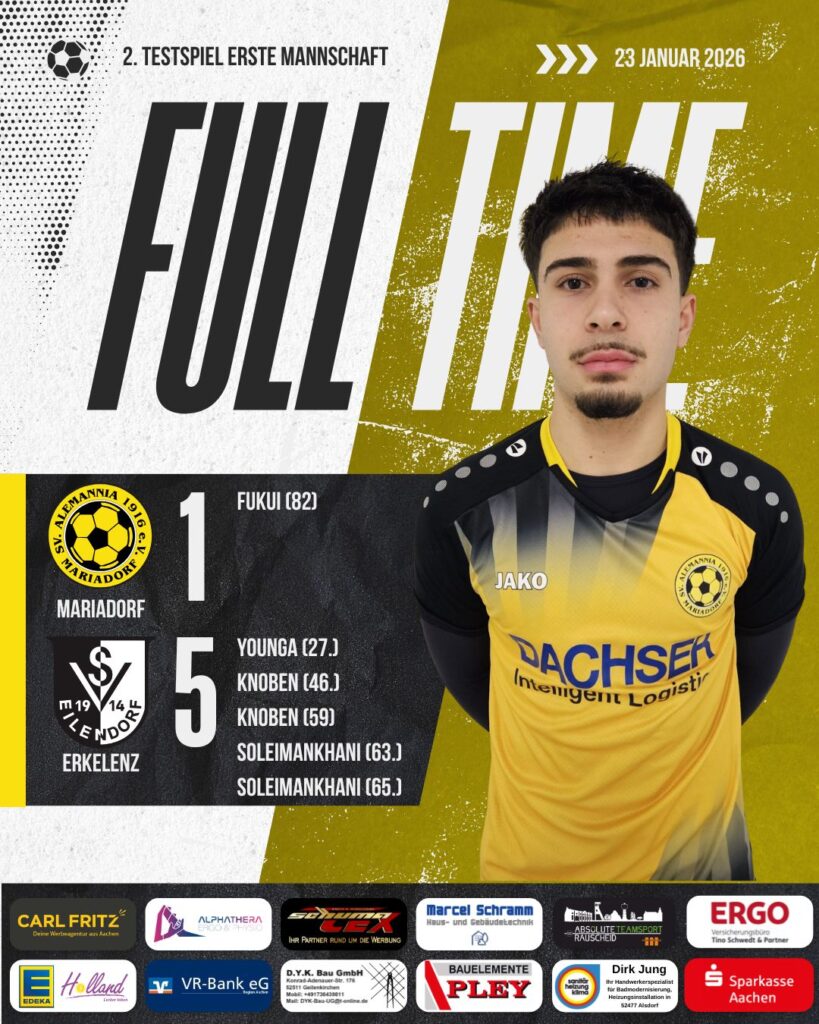 Unsere Erste Mannschaft musste sich im Testspiel dem Landesligisten SV Eilendorf mit 1:5 geschlagen geben. Gespielt wurde nach Absprache der Trainer über 3×30 Minuten. Das Ergebnis fällt deutlich aus, wird dem Spielverlauf aber nur teilweise gerecht.