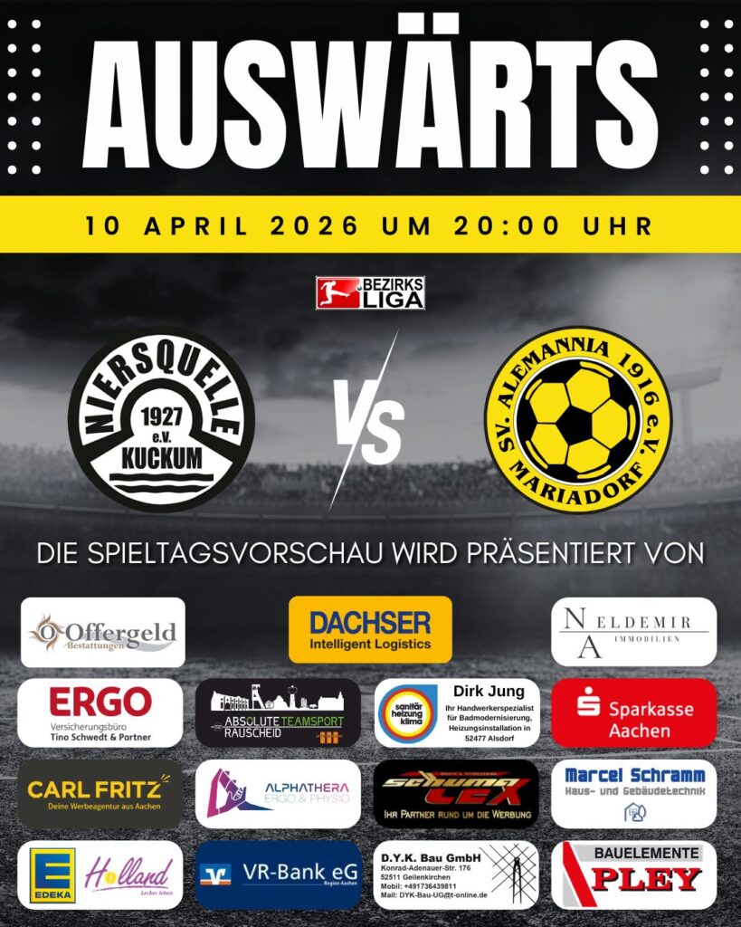 Am heutigen Freitagabend steht für unsere erste Mannschaft die nächste Partie an. Um 20.00 Uhr ist das Team von Trainer Marcel Herzog beim SV Niersquelle Kuckum zu Gast. Die Rollen vor dem Spiel sind klar verteilt, dennoch wird unsere Mannschaft die Aufgabe konzentriert angehen müssen.