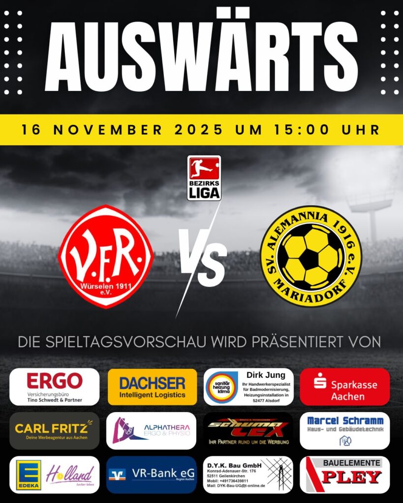 Unsere Erste Mannschaft reist am Sonntag zum VfR Würselen. Nach dem späten 3:2-Auswärtssieg in Roetgen und dem 3:2 gegen Konzen befindet sich das Team von Trainer Mirko Braun in starker […]