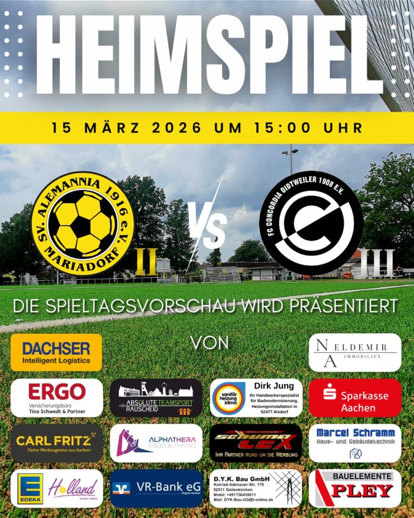 Am Freitagabend steht für unsere erste Mannschaft das nächste Heimspiel an. Um 20 Uhr gastiert der FC Concordia Oidtweiler zum Lokalderby unter Flutlicht in Mariadorf. Beide Mannschaften gehen mit 22 […]