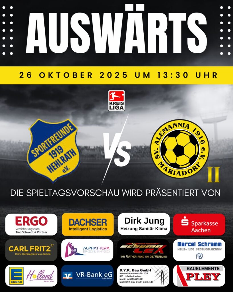 Am Sonntag ist unsere zweite Mannschaft bei den Sportfreunden Hehlrath zu Gast. Anstoß ist um 13:30 Uhr im Stadion Am Maxweiher. Nach dem 3:2-Heimsieg gegen Emir Sultan Spor will das […]