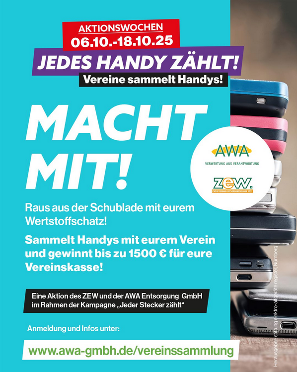 Vom 06. bis 18. Oktober ruft die AWA alle Vereine in der Städteregion Aachen und im Kreis Düren zur Aktion „Jedes Handy zählt!“ auf. Gesammelt werden alte Handys, die zuhause […]