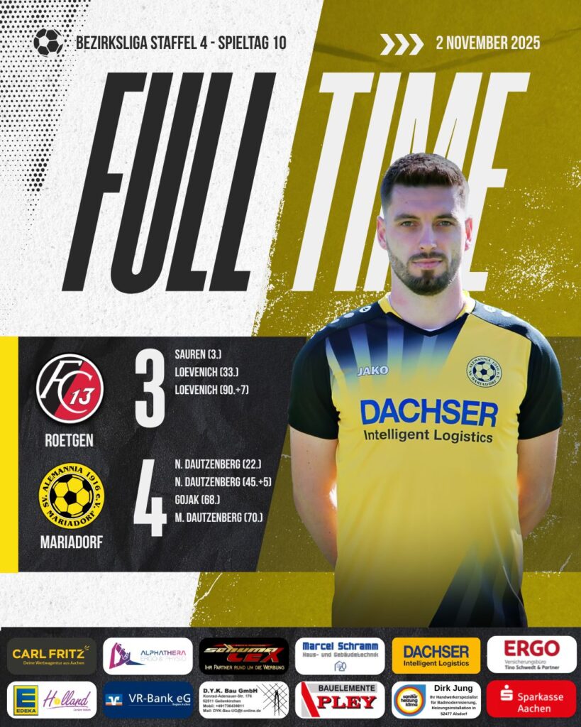 Unsere Erste Mannschaft gewann beim FC Roetgen mit 4:3. In einem offenen Spiel mit vielen Toren lag unser Team zwei Mal zurück, zeigte aber wieder Mal starke Moral und drehte die Partie verdient.