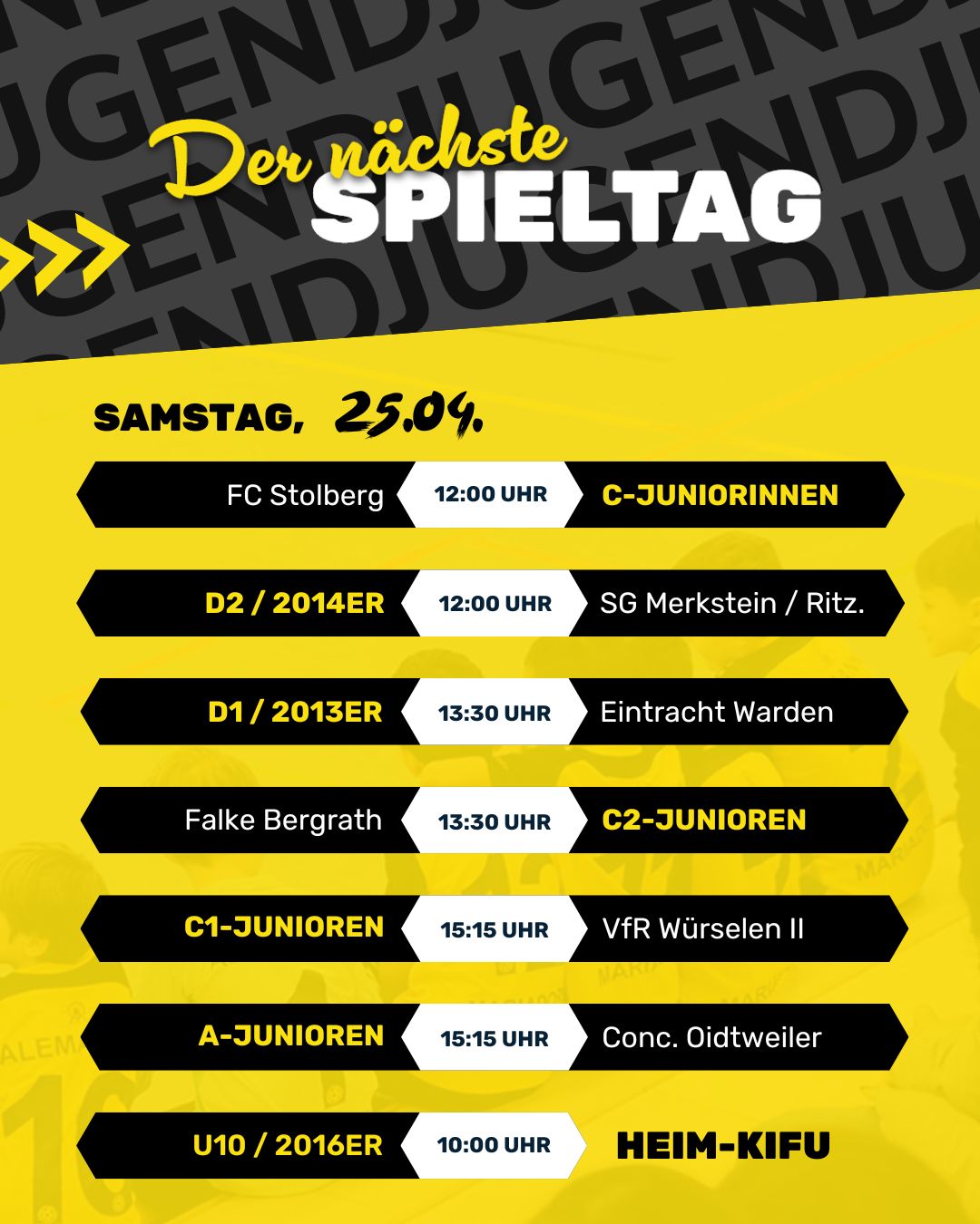 Im Anschluss stehen zahlreiche interessante Begegnungen auf dem Programm: Unsere D-Junioren, C-Junioren sowie die A-Junioren sind im Einsatz. Besonders die Heimspiele bieten wieder die Gelegenheit, unsere Teams vor Ort zu unterstützen.