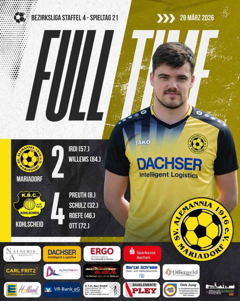 Die Gäste blieben jedoch gefährlich und nutzten ihre Chancen konsequent. In der 73. Minute stellte Daniel Simon Ott mit dem Treffer zum 4:1 den alten Abstand wieder her. Damit war die Partie weitgehend entschieden. Dennoch zeigt unsere Erste Mannschaft bis zum Schluss Einsatz und belohnte sich in der 85. Minute noch mit dem zweiten Treffer. Pascal Willems traf zum 2:4-Endstand.
