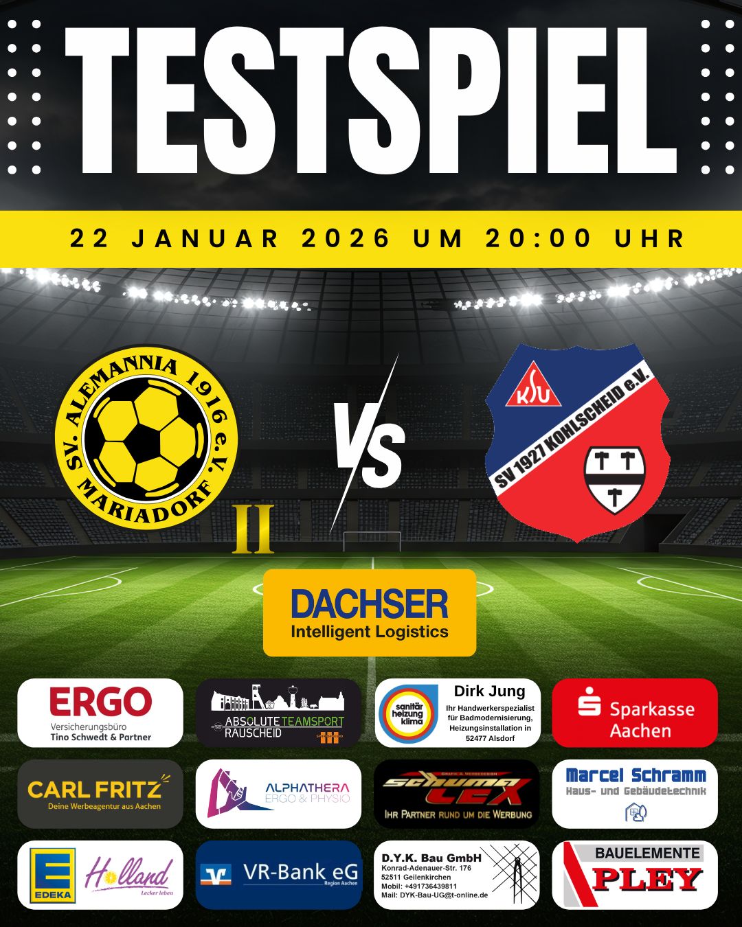 Unsere Erste Mannschaft bestreitet am Freitagabend den nächsten Test in der Vorbereitung. Um 20 Uhr ist der Landesligist SV Eilendorf im Südpark zu Gast. Nach dem intensiven ersten Test gegen Dynamo Erkelenz bietet sich die nächste Gelegenheit, weiter zusammenzuwachsen und Abläufe zu festigen.