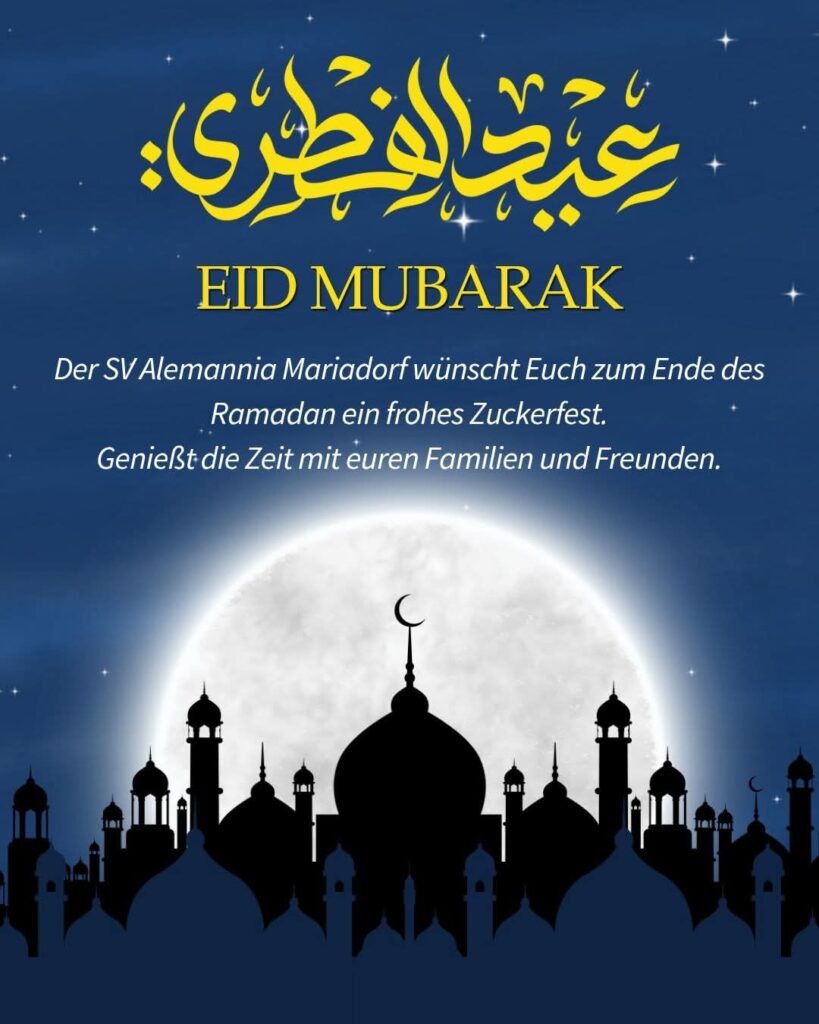 Der SV Alemannia Mariadorf wünscht euch ein frohes und gesegnetes Zuckerfest. Eid Mubarak. Nach einer besonderen Zeit des Fastens endet der Ramadan und macht Platz für gemeinsame Momente, für Familie, für Freude und für Dankbarkeit.