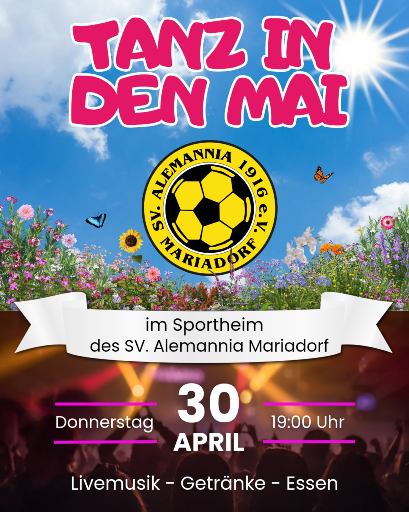 Am 30.04.2026 feiern wir ab 19 Uhr den Tanz in den Mai im Sportheim. Dich erwartet ein stimmungsvoller Abend mit Livemusik, guter Laune und bekannten Gesichtern.