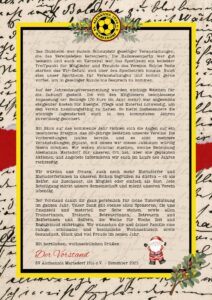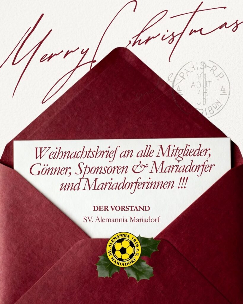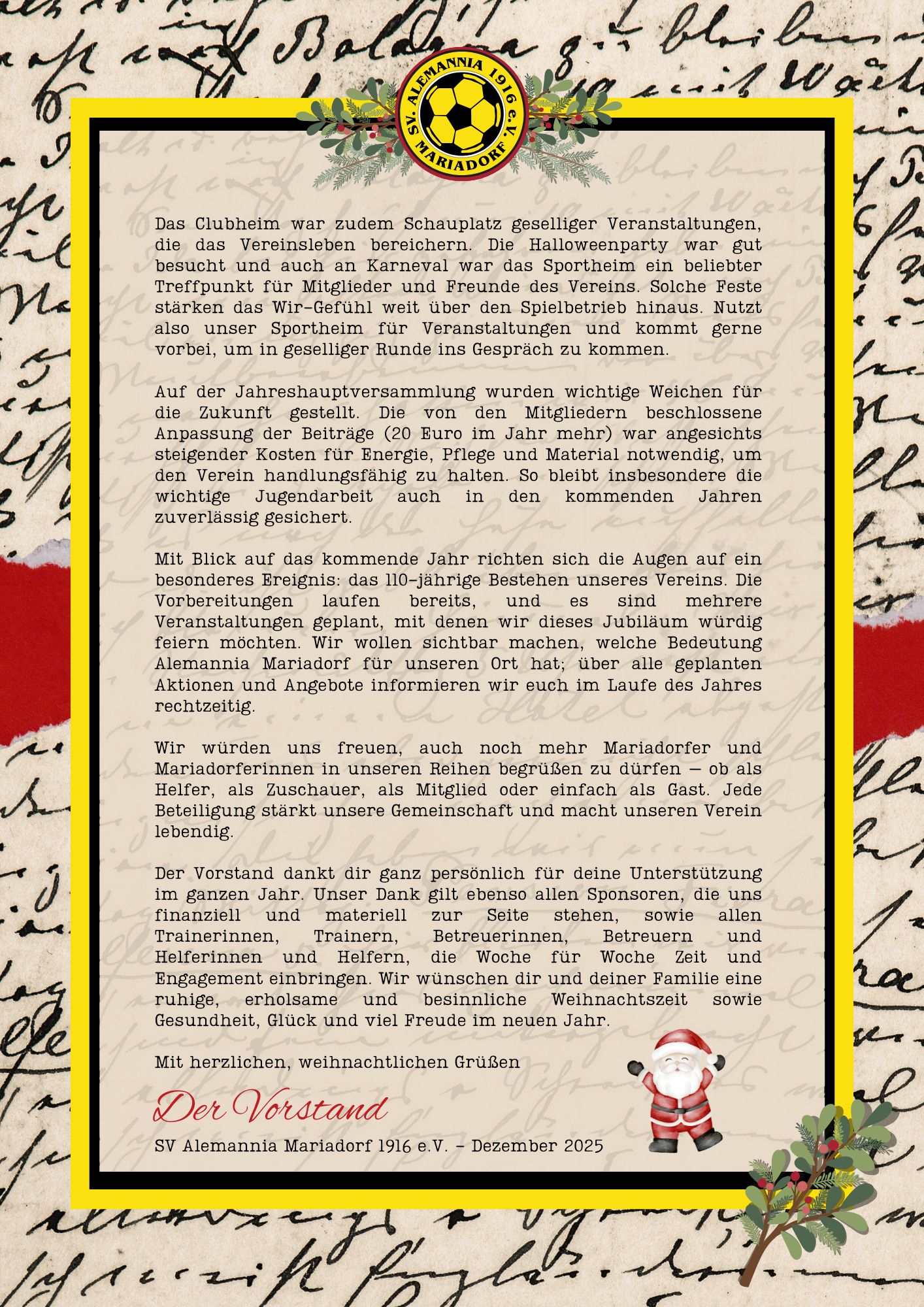 Der Vorstand des SV Alemannia Mariadorf hat sich in der Weihnachtszeit mit einem besonderen Weihnachtsbrief an alle Mitglieder, Gönner, Sponsoren sowie an alle Mariadorferinnen und Mariadorfer gewandt und damit das zurückliegende Jahr in den Blick genommen. Das Schreiben wurde an alle Haushalte in Mariadorf verteilt und macht deutlich, wie lebendig, engagiert und fest im Ort verwurzelt der Verein ist. Der Vorstand blickt darin auf ein ereignisreiches und erfolgreiches Jahr zurück, in dem sportliche Höhepunkte, gesellschaftliche Veranstaltungen und das große ehrenamtliche Engagement Hand in Hand gingen.