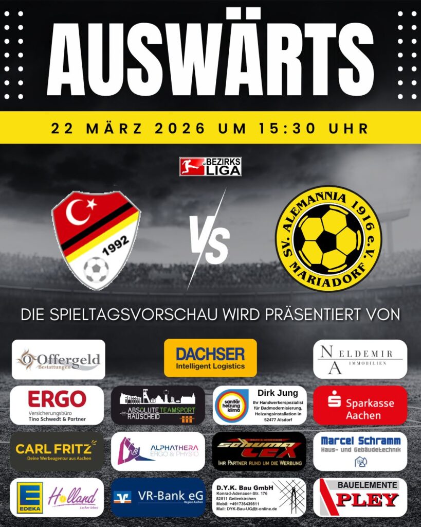 Am Sonntag steht für unsere erste Mannschaft die nächste wichtige Aufgabe an. Auswärts geht es zu Ay-Yildizspor Hückelhoven, Anstoß ist um 15.30 Uhr. Beide Teams liegen in der Tabelle dicht beieinander, die Ausgangslage verspricht ein intensives Spiel.