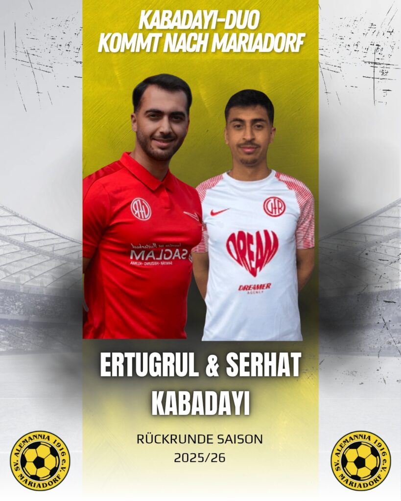 Mit Ertugrul und Serhat Kabadayi begrüßt die Landalemannia zwei weitere Neuzugänge in Mariadorf. Die Brüder wechseln gemeinsam zur Alemannia und bringen Erfahrung, Tempo und neue Optionen für die Rückrunde mit.