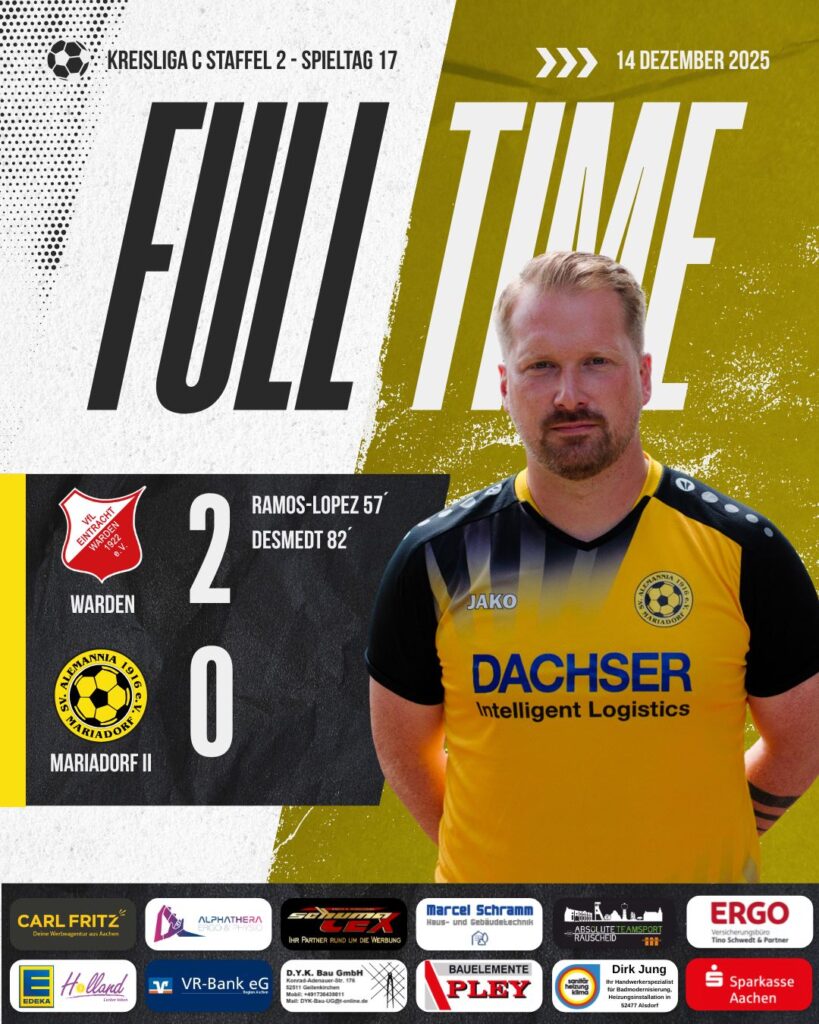 Unsere Zweite blieb dran. Meris Gegic hatte per Kopf die große Ausgleichschance. Serkan Temel vergab kurz vor Schluss eine weitere Möglichkeit. In der 82. Minute dann die Entscheidung. Ein Mariadorfer Verteidiger verletzte sich im Vorwärtsgang. Warden nutzte die Situation eiskalt und lief alleine auf den Torhüter zu. 2:0.